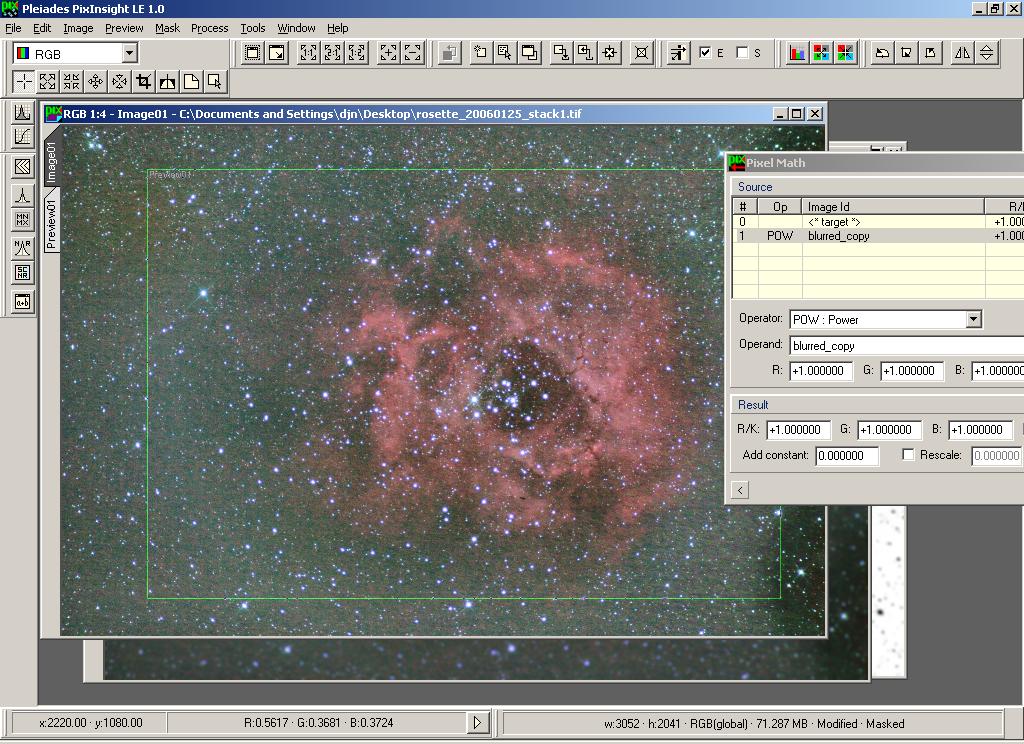 One of the processes described on the PixInsight website is called PIP - the Power of Inverse Pixels. This involves using the Pixel Math window to apply a blurred copy of an image using the Power transformation. The whole thing is masked using a mask as we have defined, and achieves the enhancement of dark areas without overprocessing the highlights. This is very useful for images of faint nebulae.